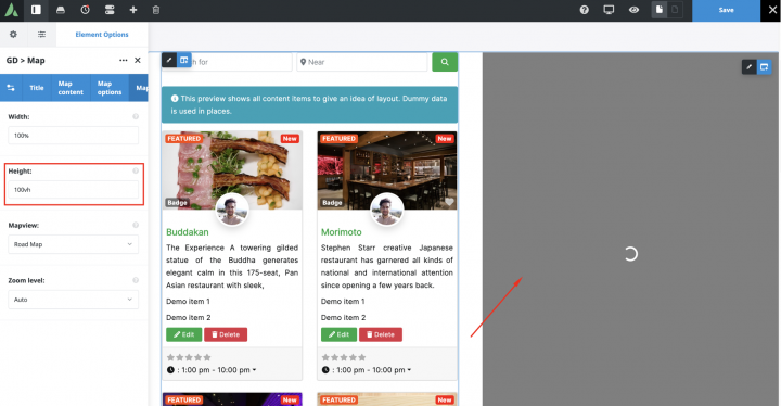 we will keep all the settings default for the GD > Map. let’s give it some height and I have decided to give it the height of 100vh.