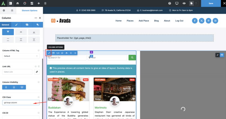 Now let’s add all required GD Detail page shortcodes on the left column one by one.
